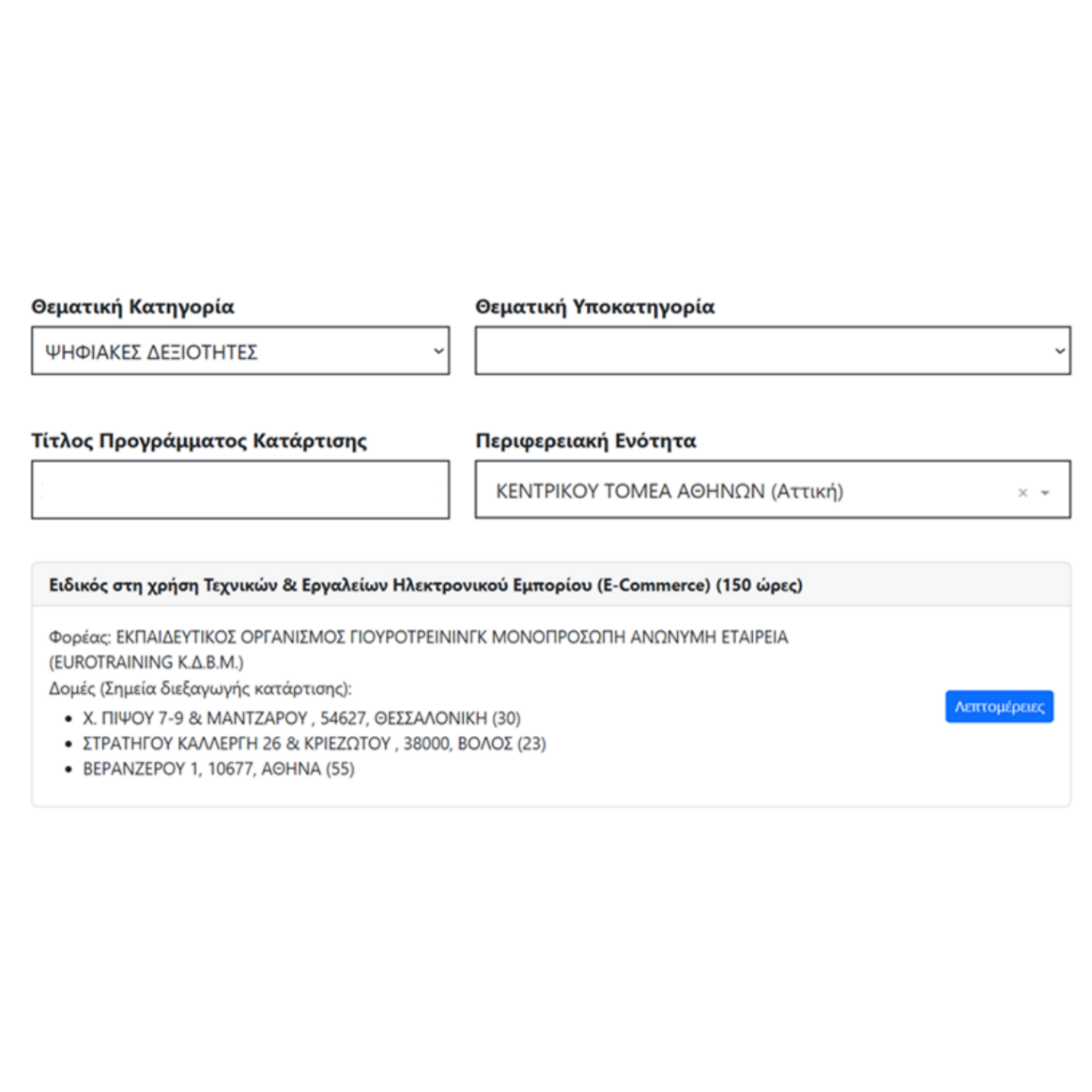Μόλις εντοπίσετε το πρόγραμμα θα πρέπει να προσέξετε στο πεδίο του Φορέα να αναγράφει: ΕΚΠΑΙΔΕΥΤΙΚΟΣ ΟΡΓΑΝΙΣΜΟΣ ΓΙΟΥΡΟΤΡΕΙΝΙΝΓΚ ΜΟΝΟΠΡΟΣΩΠΗ ΑΝΩΝΥΜΗ ΕΤΑΙΡΕΙΑ (EUROTRAINING Κ.Δ.Β.Μ.) όπως εμφανίζεται στην παραπάνω εικόνα.